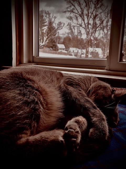 My cat SLADE is not bored at all with the beautiful snow falling heavily on this late February day outside our cold living room window. But he seems unnaturally calm even for him. He will remain at peace until hunger pangs come in a few hours’ time. Then in a flash of milliseconds he will demand his suddenly ravenous appetite be fed. At this moment, however, he is snuggled warmly against his blue blanket. As for me – I am in a meditative mood, transfixed by the swirling winter scene magically unfolding before my eyes, appreciating it all as an ephemeral scene in the cycle of life.